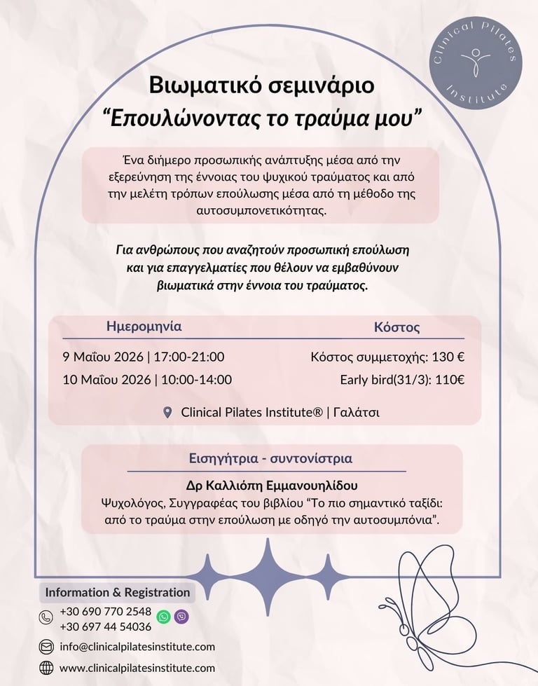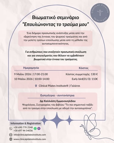 📌 Το σεμινάριο θα πραγματοποιηθεί στο χώρο του Clinical Pilates Institute®, Αγ. Γλυκερίας 7, Τ.Κ.11147 Γαλάτσι Αττικής.