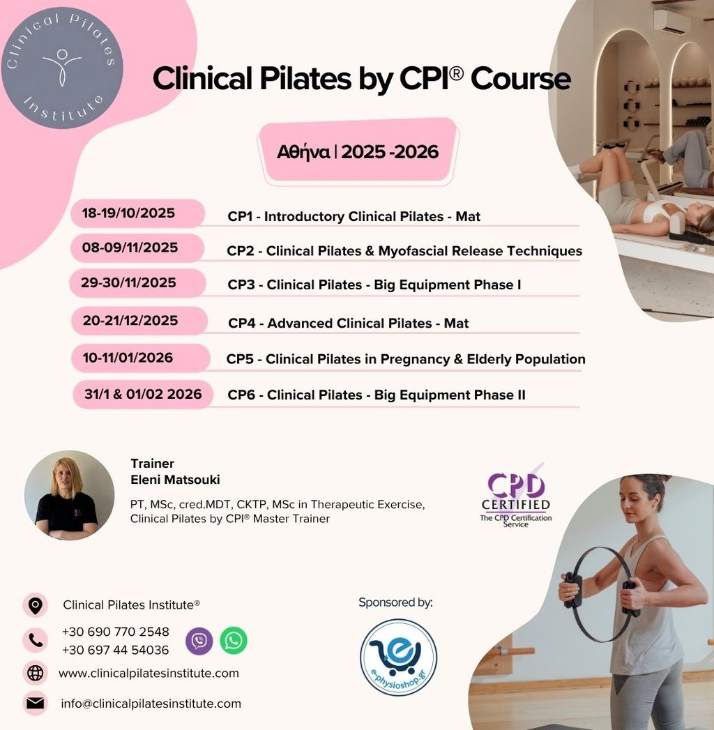 Το Clinical Pilates Institute®, ανακοινώνει τη διοργάνωση του νέου κύκλου επιμορφωτικών σεμιναρίων Clinical Pilates by CPI στην Αθήνα για την εκπαιδευτική περίοδο 2025-2026 με κεντρική εισηγήτρια την Ελένη Ματσούκη PT, MSc, cred.MDT, CKTP, Clinical Pilates by CPI® Master Trainer και άλλους διακεκριμένους επαγγελματίες υγείας.