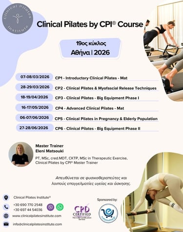 Το Clinical Pilates Institute®, ανακοινώνει τη διοργάνωση του νέου κύκλου επιμορφωτικών σεμιναρίων Clinical Pilates by CPI στην Αθήνα για την εκπαιδευτική περίοδο 2025-2026 με κεντρική εισηγήτρια την Ελένη Ματσούκη PT, MSc, cred.MDT, CKTP, Clinical Pilates by CPI® Master Trainer και άλλους διακεκριμένους επαγγελματίες υγείας.