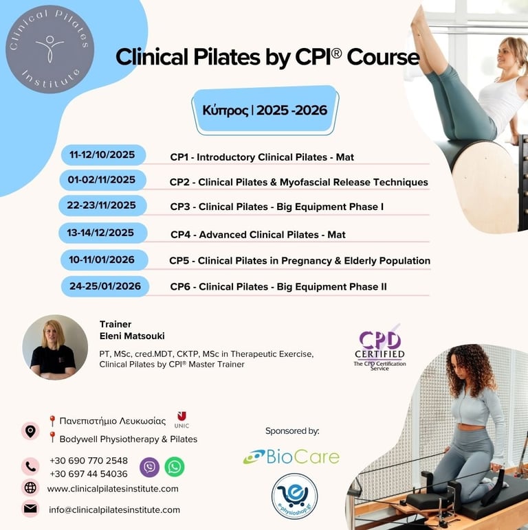 Το Clinical Pilates Institute®, ανακοινώνει τη διοργάνωση του νέου κύκλου επιμορφωτικών σεμιναρίων Clinical Pilates by CPI στην Αθήνα για την εκπαιδευτική περίοδο 2025-2026 με κεντρική εισηγήτρια την Ελένη Ματσούκη PT, MSc, cred.MDT, CKTP, Clinical Pilates by CPI® Master Trainer και άλλους διακεκριμένους επαγγελματίες υγείας.