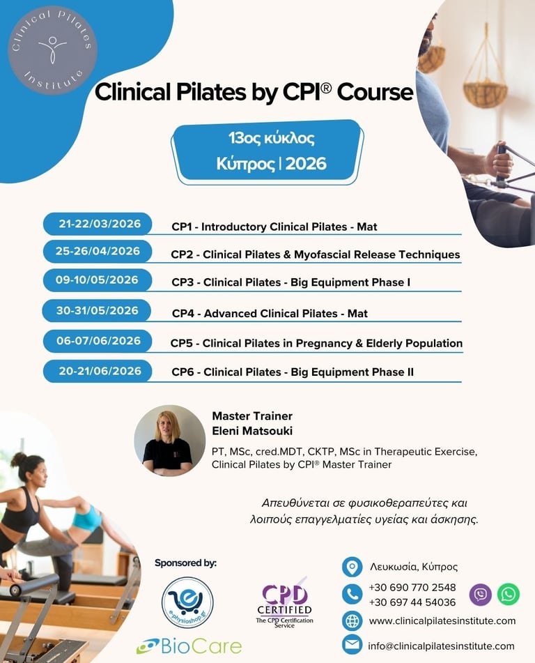 Το Clinical Pilates Institute®, ανακοινώνει τη διοργάνωση του νέου κύκλου επιμορφωτικών σεμιναρίων Clinical Pilates by CPI στην Αθήνα για την εκπαιδευτική περίοδο 2026 με κεντρική εισηγήτρια την Ελένη Ματσούκη PT, MSc, cred.MDT, CKTP, Clinical Pilates by CPI® Master Trainer και άλλους διακεκριμένους επαγγελματίες υγείας.