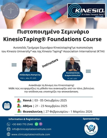 📌 Το σεμινάριο θα πραγματοποιηθεί στο χώρο του Clinical Pilates Institute, Αγίας Γλυκερίας 7, Γαλάτσι, Αττικής